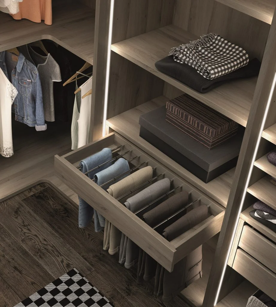 Con un armario estándar muchas veces te adaptas tú al mueble. Con uno a medida, el mueble se adapta a ti. Puedes elegir distribución interior: barras de colgar, estantes, cajones, zapateros, baldas para ropa doblada… según las necesidades de tu familia.